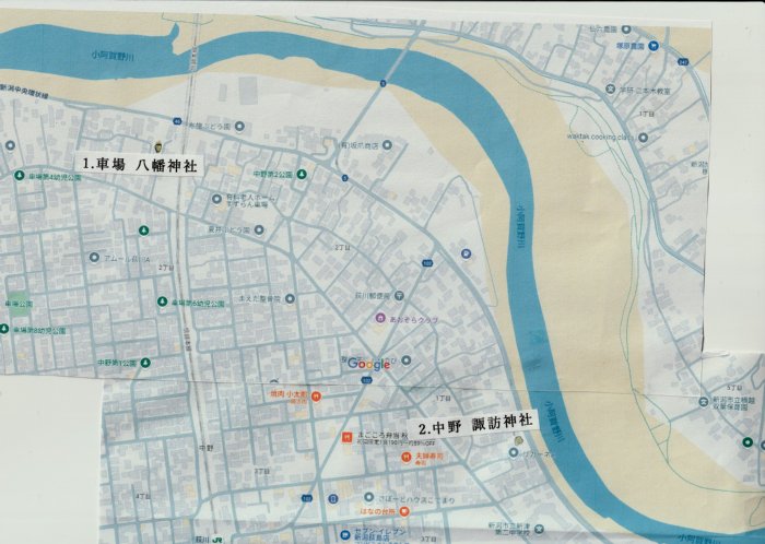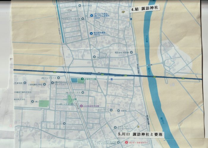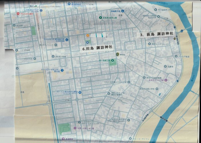 荻川地区の神社巡りを紹介しましょう ぐる〜っと6神社を巡れば5km以上の歩きとなります。仮に荻川駅を出発、帰着点と仮定します。 先ずは620m北上し、信越線脇の 1.車場 八幡神社 そこから南へ680mで 2.中野 諏訪神社 その後 更に620m南へ、県道脇の 3.荻島 諏訪神社 更に760m南へ 4.結 諏訪神社 更に660mで 5.川口 諏 訪神社(脇に伝説の婆池) 再度市街地を1,390m北上して 6.田島 諏訪神社 ですが、そこから荻川駅ま では660m 合計5,390m |
