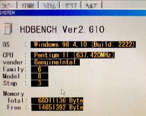 クロックアップ大好き最近は私も何かコンピュータ暴走 族のようになってしまい、クロックア ップにうつつを抜かすようになりました。 ようやく手に入れたセレロン533 MHz を 無理矢理FSB 75MHz で動かしています。 結果は結構スピード感を得られます。 え?証拠に、ここに HDBENCH によ る周波数測定の画像を張り付けておきます。 ほら650MHz ですよ。 と言いながら、結局はまた新しいセレ ロンも買ってしまっています。 700MHz 程度のが一番コストパフォーマンスかなあ…って感じます。 (もう、昔の話でした。)