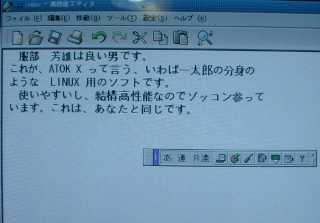 Linux のことWindows XP が出て いる。これは1台ずつ 認証しないと使えない のです。 OS として1つあれば、 何台のコンピュータに もインストールでき るようには出来ないわ けですね。ケチだなあ。 だから、5台持って いたら、5つのWindows を購入しなくてはならな い訳です。 そこで急にタダで手に 入るLinuxがとても好き になってしまったのです。 Windowsよりも高性能かな?固まらないし ソフトはみんなタダで手に入るしね。でも一太郎だけは使い慣れているから… 使いたいのだなあ… 見てください。一太郎の辞書、ATOK X です。これを立ち上げてエディタを使っ ていると、まさに一太郎でしょう。しばらくはゾッコンでございます。 Linux の事で何か知りたいことがあったら、連絡下さいね。