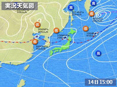 予想天気図はこれ。低気圧が5つも並び、前線が