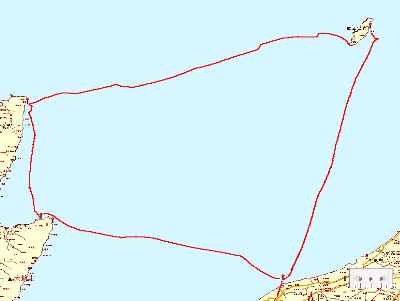 ![]() 横(東西)に引き延ばした地図…こんな航跡でした。潮の流れに翻弄されたところもあります。 |