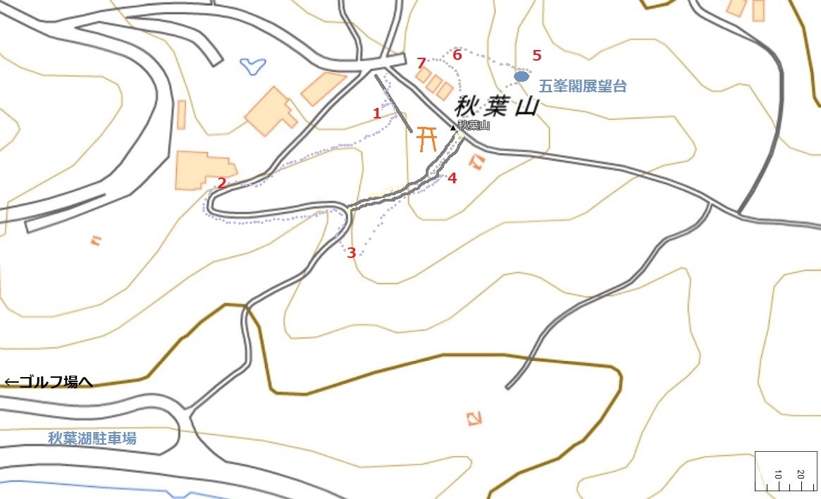区役所建設課が設置した秋葉公園パノラマロングを歩 いてみました。徒歩60分、高低差60m距離2,300m と 書かれています。公園駐車場、噴水脇に案内パンフが あります。 秋葉神社へ向かう所から始めると分かり易いです。そ の神社の階段途中にPoint1があります。少し登ると右下 道路に繋がる道がありますから、下ってPoint2へ行きます 後はその道路を歩いて、Point3,4と。4からは道路を下が って、反対側の細い階段を上って五峯展望台へ。 展望台前にPoint5, 展望台への上り道を下るとすぐ左に Point6 が。水道タンク脇を歩いてpoint7 に向かいます。 |