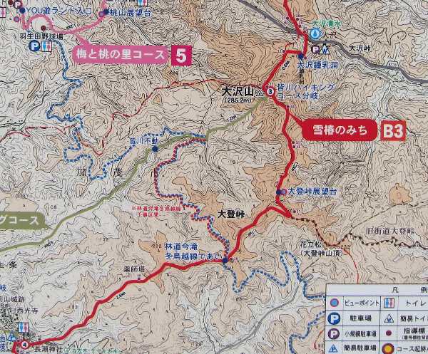 大沢峠から鍾乳洞を経て「大沢山」頂上を目指すと、案内板に「加茂川・長瀬 神社」と書いてある。これが大登峠を通ってのハイキングコース「雪椿のみち」だ と言う事を後になって知った。 下の地図も案内用の看板を写真でおこしたモノだが、距離も長くは無い。 少々山が深いので、大勢で楽しく歩くなら良いコースであろう。 |