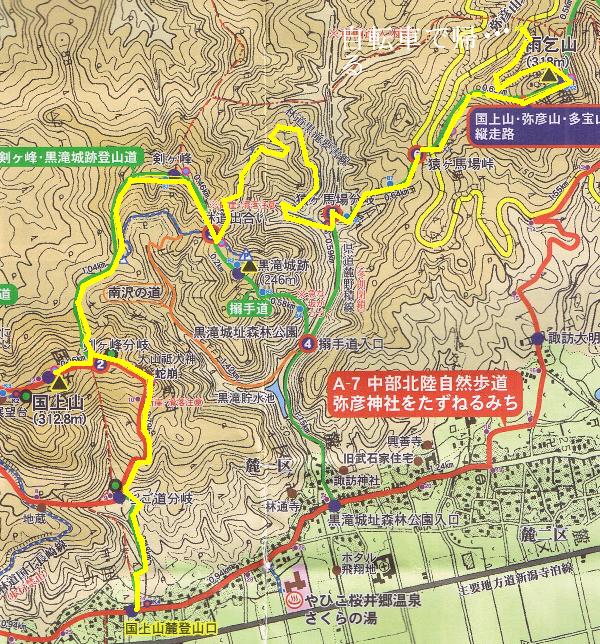 国上山〜雨乞山の縦走し、元に戻って帰る手立てを紹介したい。車は「さくらの湯」か「弥彦村営駐車場」へ置く が、予め、自転車を雨乞山のNTT施設の管理道路下に置いておく。(車で運んでおき、その車を駐車場へ回す。 そこから登山口まで歩く。) 麓集落のある家の脇から登山道が始まる。その道を登って、稚児道の途中に合流する。そこから僅かで「弥彦山 へ分岐」の看板がある。分岐からは坂を転がるように林道まで。その後(黒滝城趾公園)林道を下って、県道「麓野 積線」に合流。野積方向へ100mも歩かずに「猿ヶ馬場分岐」に至る。右折して、右手に川を見ながら山を登るとス カイラインの「猿ヶ馬場峠」に出る。道路を越えて、雨乞山の登山口を登ると、NTT施設を眺めながら、頂上へ達す る。帰りは管理道路を下って、自転車にまたがる。駐車場までは7kmほどあるが、下りなので、一気に戻る事が出来る。 |
