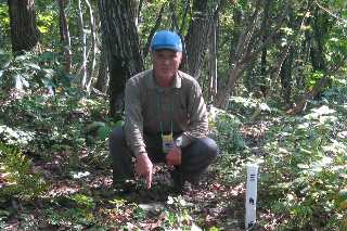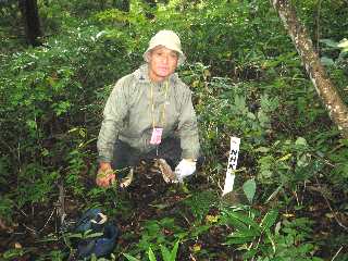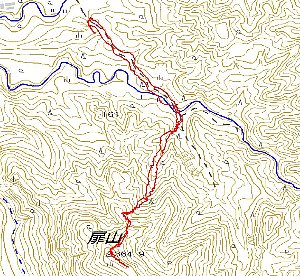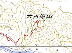 R49から三川の道の駅、「将軍杉」へ向かう道を進み、更に三川温泉へ向かう。途中から中ノ沢川に沿って上流へと登ると、両留山が見えて くる。この山の北が笠菅山で、サテライト局のアンテナが建っている。 上島集落に向かうこの道が中ノ沢川にかかる橋を渡った所に車を停め て、農道を歩く。突き当たったところの尾根に登る。ここは急登で、厳し い。左の沢を登っても良いようだ。(帰路はそこを歩いた) 杉林を過ぎ、尾根の印(杭)を辿りながら頂上を目指すと、藪の中に テープが見える。たぶん、登山道を意図しているのであろう。頂上付近 は、踏み跡が良く分かり、登山道らしくなっている。頂上は眺望良く、眼 下には三川温泉が見えた。 |