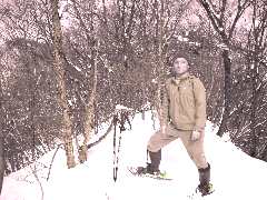 白山、大蔵岳など有名な山並みを眺めながら稜線を歩くこの登山は素晴らしいの一言である。 前から道が無いと聞いていたので、残雪で雪の締まったこ の日をねらって登った。慈光寺の手前のお地蔵さんの後ろ から枝尾根をよじ登ると送電線巡視路に突き当たる。ここか ら登れるだけ上を目指す。途中平坦な所は神戸城趾だろう。 左手に神戸山が大きく目に入る。進む目の前の山はほぼ 600mはあろうか、登り終わったら左の尾根に下る。(右の尾 根も進んでみた。) そして尾根伝いに神戸山を目指す…が、疲れも出て、ま だか…と言う気持ちを抱かせる尾根の長さだ。さすが、灌木 が雪に埋まり360度視界が開けている。白山から右回りに遠 く弥彦も見える。管名、大蔵、権現、日本平までパノラマだ。 |