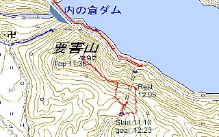 「百山百色」にある通りの登り方をした。今頃になっていても「雪で通行止め」という看板があり、県道から歩いた。 往復で6kmはあっただろうか、これは辛いし、水の落ちる トンネルを歩くのも厳しかった。ダムの上の道路を歩き、 常磐トンネルを出るとすぐ左に丸太の橋があり、送電線の 点検路があった。ここを登って、鉄塔下で休む。そこか らは、尾根を藪漕ぎになるが、踏み跡が何となく残ってい るので、慎重に辿る。1つピークを越えると僅かだが下がっ て、頂上を目指す。頂上は何も無いので、GPSで見当を つけて、自分で決めた。木々の隙間からは、内の倉湖、 焼峰、高知山等が見える。天気が良く、湖面がきらきら反 射していた。 |