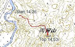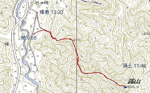 国道289号線で八木まで走り、そこから県道183号線を右折、吉ケ平方面に進む。よってけ亭が左にあるが、過 ぎて、新守門橋を渡ったところで左折すると岩ヶ崎集落 だ。テレビ塔がある山が蕗山だと聞いていたので、テレビ 塔を目指す。これは踏み跡がしっかりしている。電柱に そって登って行くこともできる。 テレビ塔が370m地点。ここで一服して目の前の岩山 へ向かう。見える山が頂上だと思うと甘い甘い。登り着く と、蕗山の頂上が左手に見えてくるので、ファイト!だ。 岩山にはロープもあり、「道が無い」と言う噂もちょっと ?だ。頂上は広場のようで、眺望も良い。お薦めの山だ |