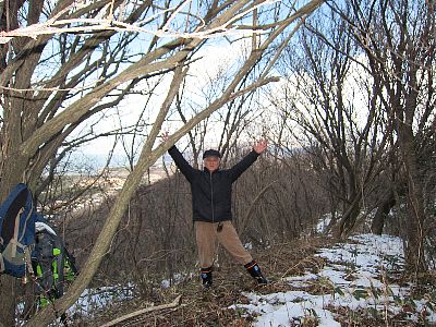 赤坂山を何度か登って、ふと見ると、弥彦山方向に赤坂山より高い山が見えます。ホームページなどにあるので、私も登ってみよ うとスノーシューを持って出かけました。小学校の裏の大地道を歩き カーブを曲がるとすぐに、踏み跡が見つかるので斜面に取り付きまし た。高い所を狙って右往左往しましたが、結局北側の尾根が頂上へ 続いていることに気付き、登るとここにも踏み跡があります。もう登山 道の様です。山頂付近はイバラが多く、時間が掛かった。鉈鎌を持 って来ると良いと思いました。写真の通り葉の落ちた木々の間からは 寺泊の街、港、佐渡や弥彦山まで一望できる素敵な山です。 ぜひここをメジャーな山に、観光地にして欲しいものです。 地域の振興に関わってくださっている多くの方に感謝!です。 |